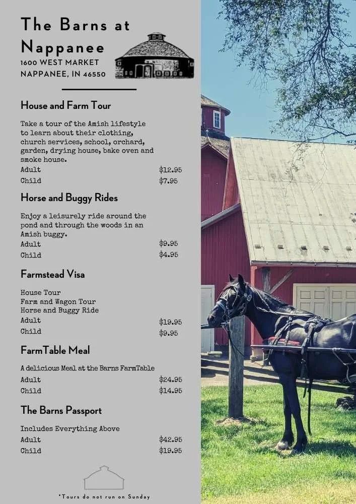Enjoy an amazing tour of Amish life at the Barns at Nappanee! Take a full farm tour or enjoy a leisurely buggy ride around the ponds and through the woods. All of our tours can be combined with an amazing meal for one low price!
